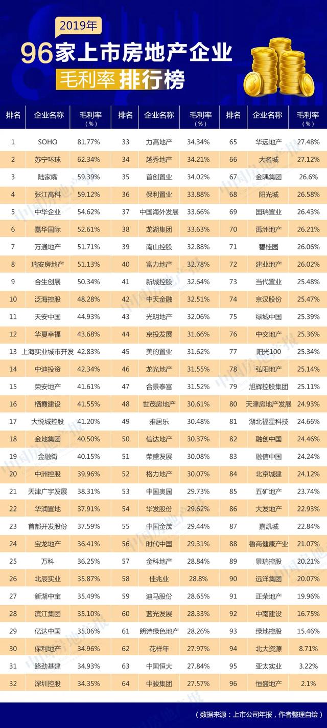 值得注意的是,SOHO在2019年的毛利率为这近百家企业中最高的,高达81.77%,较2018年的74.69%又上升了7.08%,而SOHO在2018年和2017年就一直位于中国内房股销售毛利率榜首的位置。SOHO的主要业务为投资房地产开发、物业租赁及物业管理,SHOH的营收主要来自于北京“望京SOHO”“光华路SOHO”“丽泽SOHO”和前门大街项目及上海外滩SOHO等四处核心商业区的出租和销售,这些商铺的出租率都非常高。此外,苏宁环球(62.34%)、陆家嘴(59.39%)、张江高科(59.12%)、中华企业(54.62%)、嘉华国家(52.61%)、万通地产(51.71%)、瑞安房地产(51.13%)、合生创展(50.34%)在2019年度的毛利率也高于50%。