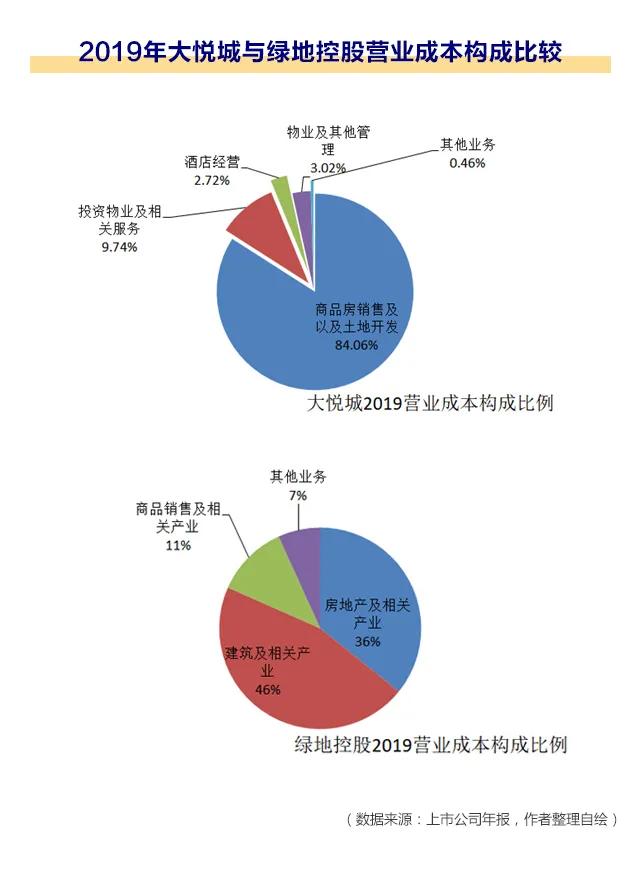房企营业成本构成差别很大,下图比较了大悦城和绿地控股2019年营业成本构成情况: