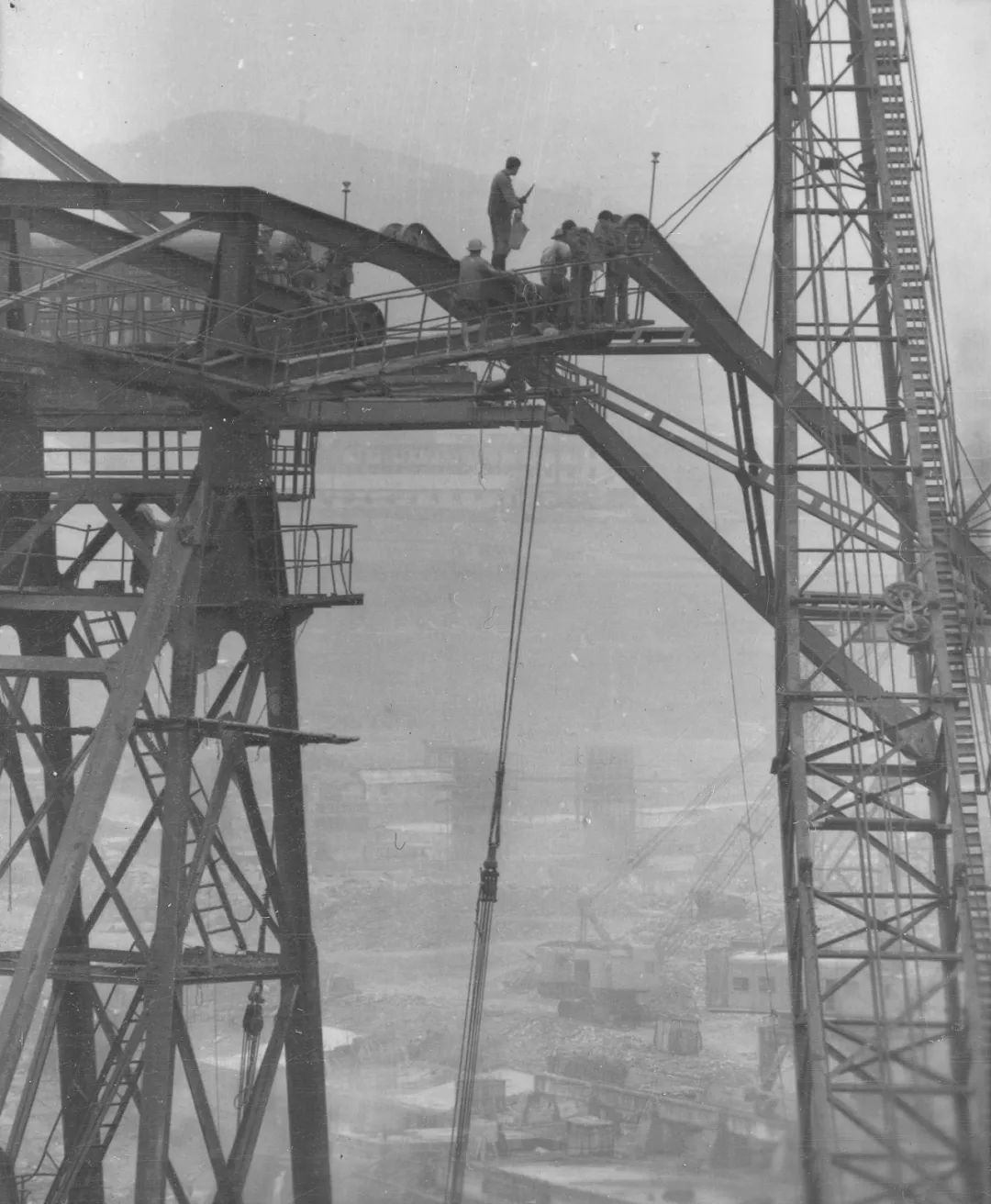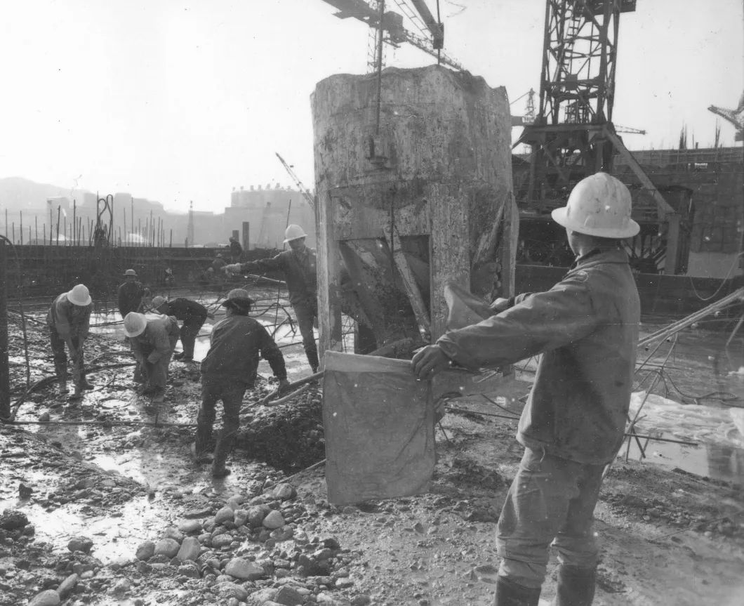 建企之初,其任务是葛洲坝工程建设。在计划经济体制下,工程建设所需成套设备、施工设备、物资材料完全依靠国家计划供给,渠道单一、数量有限。机电物资保障是工程建设重中之重,工程局的组织架构以“资源”为中心进行设置。安装分局工人进行安装砂石厂浇筑队作业