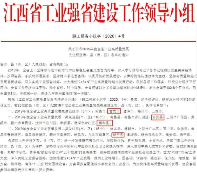 近日,江西省工业强省建设工作领导小组公布2019年度全省工业高质量发展先进设区市、县(市、区)名单。按照《江西省工业高质量发展考核评价办法》(赣工强省小组字〔2020〕1号)要求,经考核评价,确定总分排名前5位的设区市、前25位的县(市、区)为2019年度全省工业高质量发展先进设区市、县(市、区)。