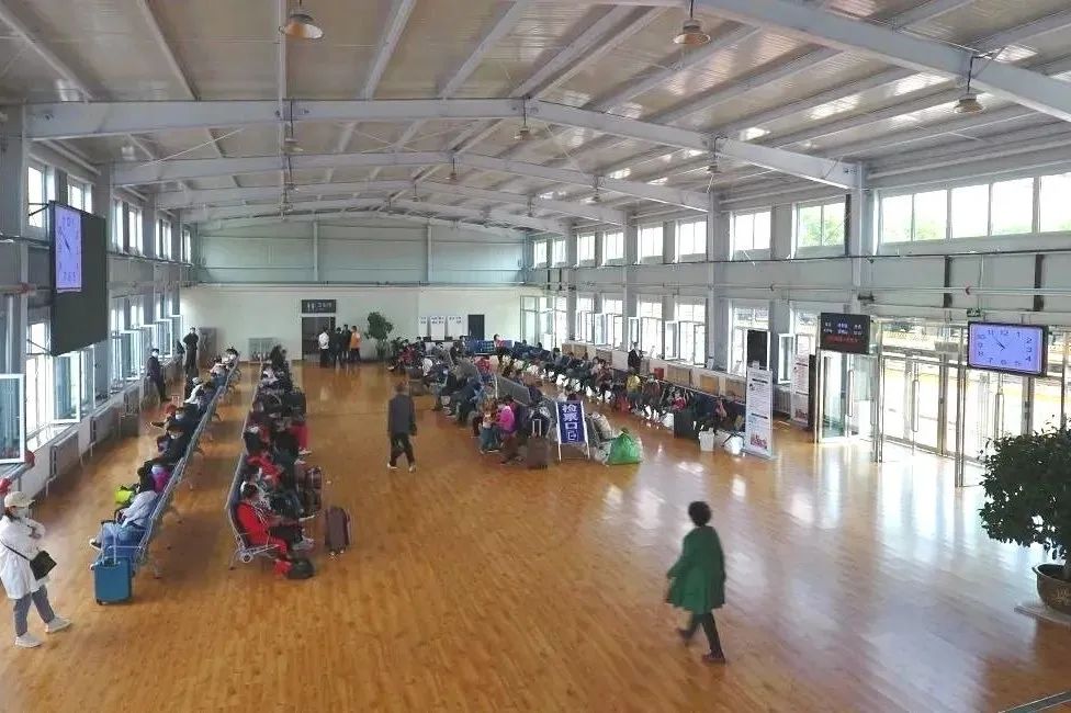 该站房一楼为160平方米的售票厅,设置5个售票窗口、4台自动取票机。旅客购票后通过验证安检通道进入二楼900平方米的候车大厅。因鹤岗站特殊地形,二楼候车厅出门便是站台,旅客可直接通过新规划的通道进入建在原2、3道的临时站台乘车。虽然临时站房只是一个过渡,但车站为旅客服务的标准没有降,在进站流线发生变化后,他们加强了引导,确保旅客乘降安全。