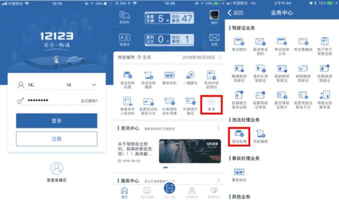 登录"交管12123"APP后,通过【业务中心】→【违法处理】,进入违法处理业务流程。