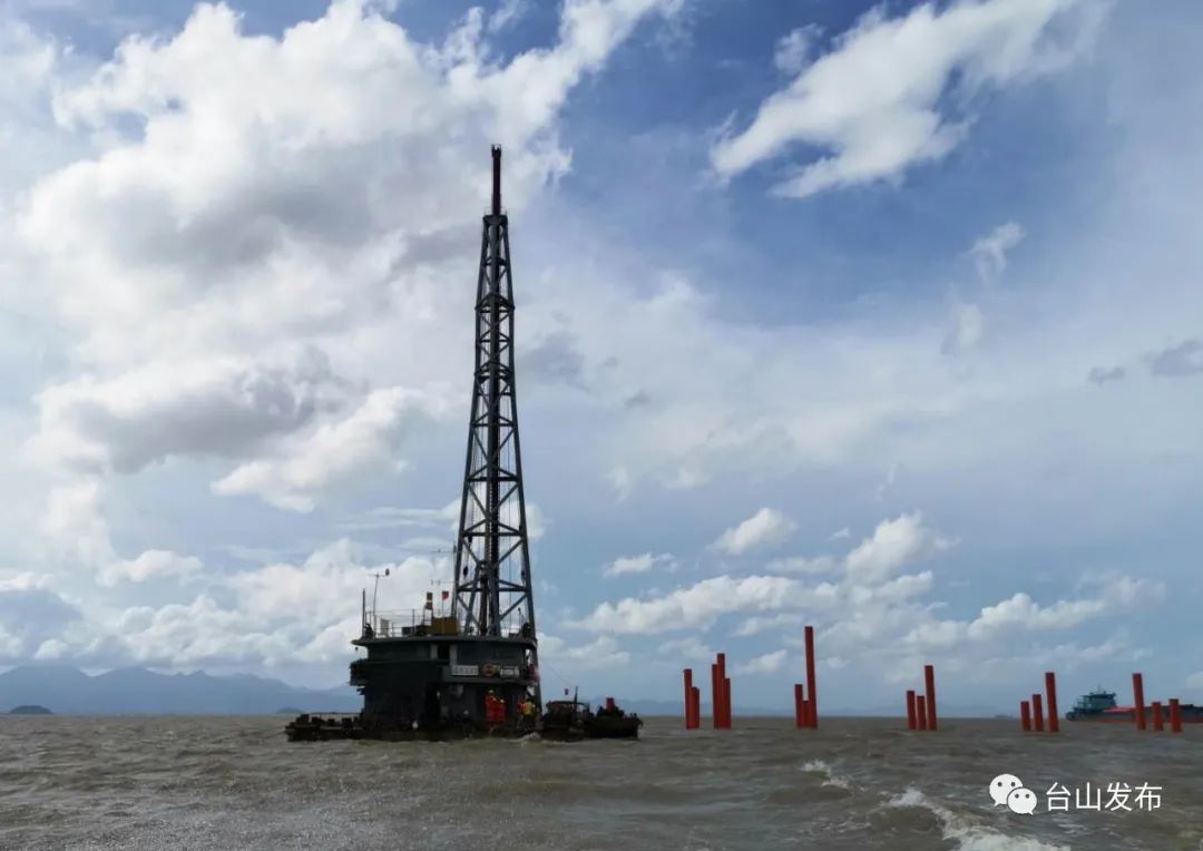 6月6日上午11时26分,在台山黄茅海海上,黄茅海跨海通道项目建设者打下施工钢栈桥第一根钢管桩。此举标志着该项目正式开工。