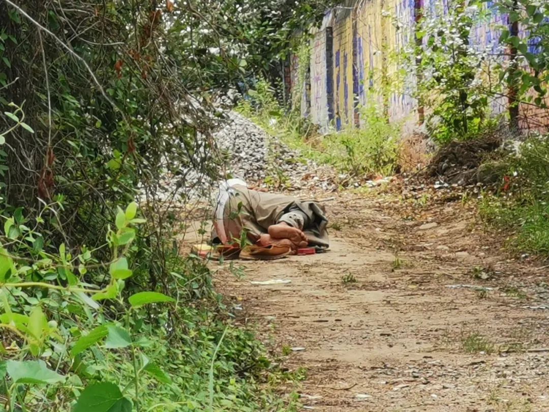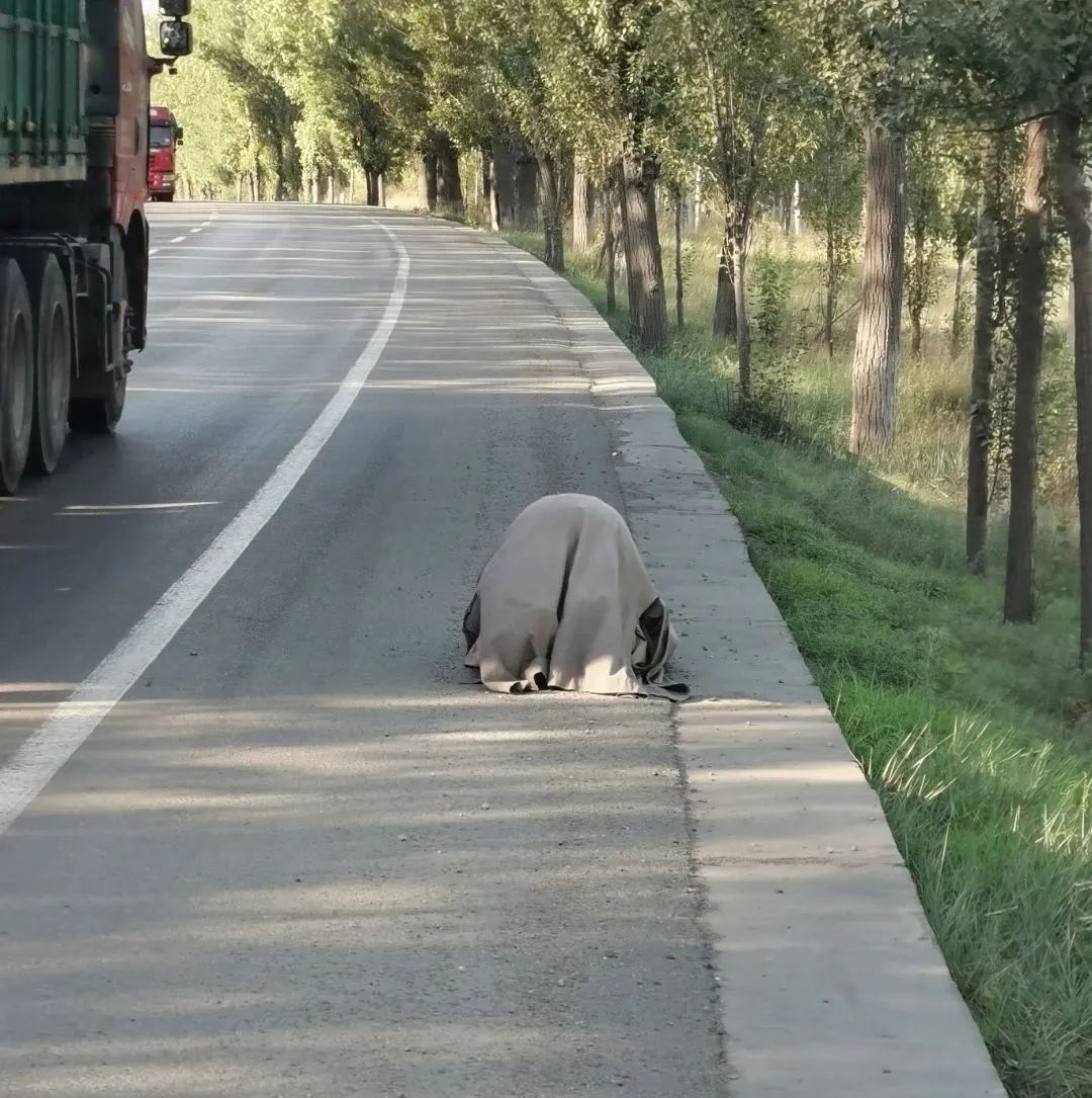 做完这一切差不多快到六点,走到上次叩拜到的位置,继续朝前磕头,一直到11点多。偶尔累了,坐在树荫里休息一会儿,一般不超过一分钟。