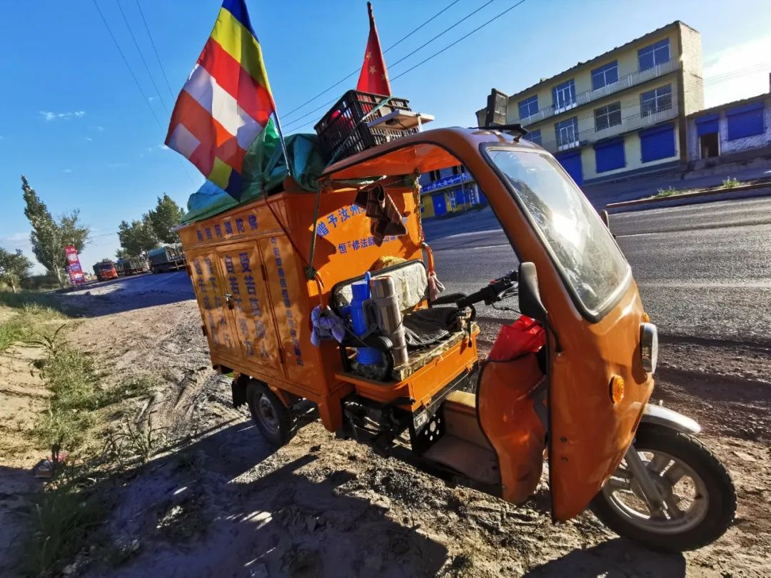 这下子彻底确定了,毕竟一般三轮车不会刷成黄色贴着偈子,上面还插着一面国旗一面佛旗。