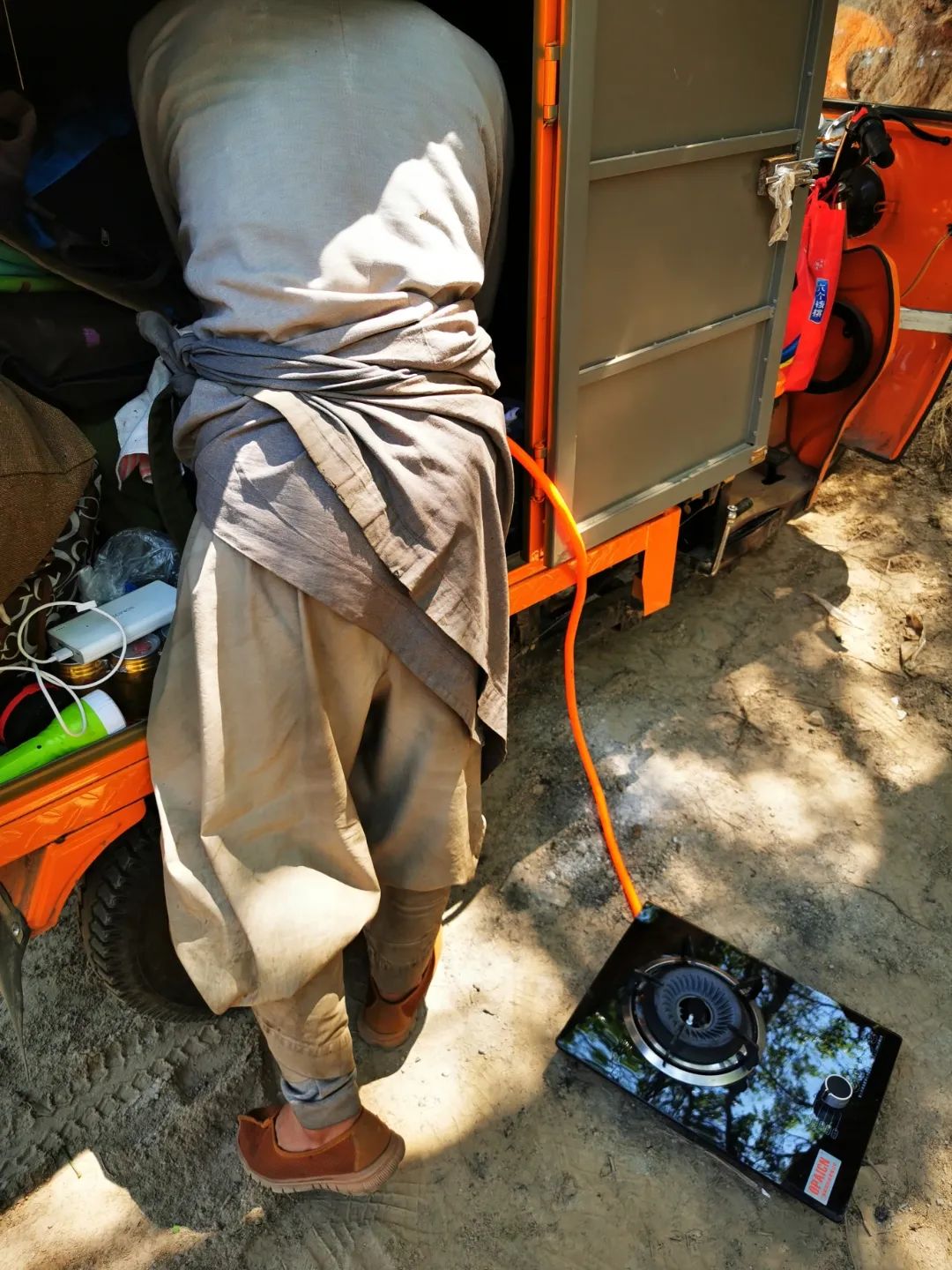 老实说,我已经觉得小车车厢是四次元空间了,从里面翻出来什么都不奇怪。他把灰色僧袍撩起来扎进腰里,先从车厢里翻出来一个灶台,灶台上连着一根黄色管子,我顺着这根管子往车里瞧,看见车里面有一罐……液化石油气。