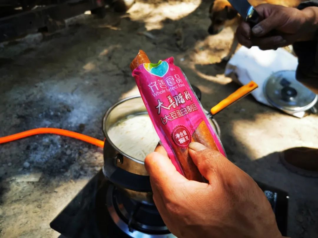 僧人摸出来两根大豆火腿肠,说这是别人供养的,也不知道啥味道,加进去吧。看见我在拍照,他专门强调,这可不是肉,是豆制品的香肠,之前路上有专门卖豆制品的商店。