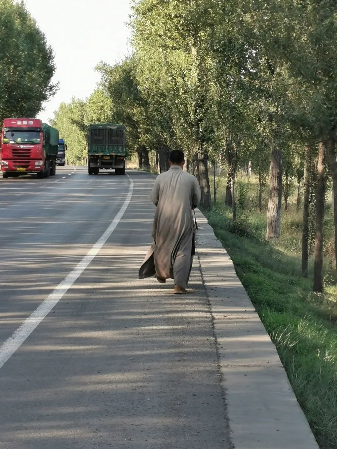 继续往前骑,不知道明天能不能骑到五台县,那边还有更多的文物要去看。骑着骑着,看见一个穿灰袍的僧人正沿着马路,三步一叩首。两车道的马路,卡车像是游鱼,声波和尘土朝着道路两侧扩散。