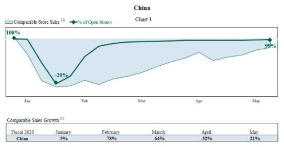 销售数据上,销售额暴跌78%的最艰难2月已经过去。与上一年相比,中国市场在5月的同店销售下降了21%,但比四月下降的32%有所提升。5月最后一周的同店销售额下降了约14%,显示出持续上升的势头。