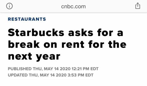 实际上,早在上个月星巴克就曾致函房东,要求在未来12个月内给予租金优惠。