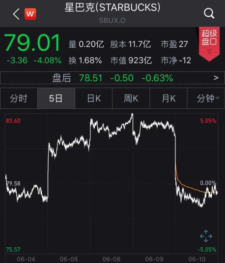 受信中所披露的财务信息影响,昨夜星巴克美股大幅走跌,截至收盘股价跌4.08%,盘后再跌0.63%,是近一个月来的最大盘中跌幅,报78.51美元/股。最新总市值约为918亿美元,较前一交易日收盘缩水约50亿美元,折合人民币约350亿元。