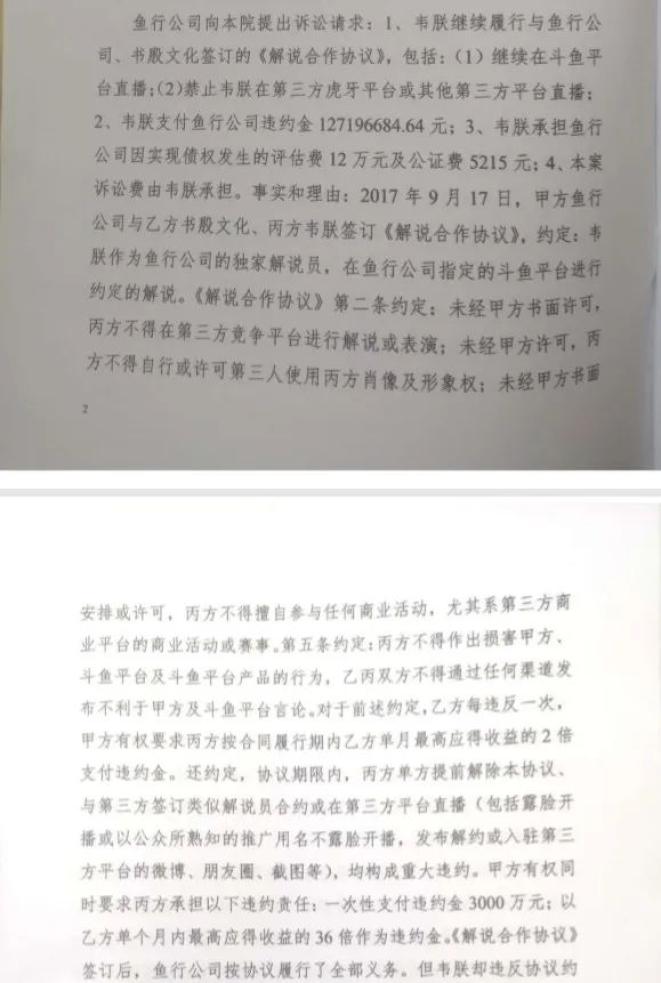 为此,鱼行公司向法院提出诉讼请求,要求韦朕履行《解说合作协议》中“继续在斗鱼平台直播”和“禁止韦朕在第三方虎牙平台或其他第三方平台直播”等,同时需支付违约金约1.27亿元。