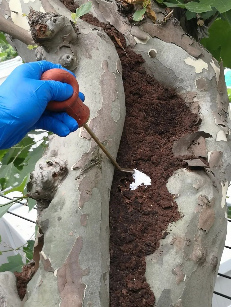 在调查中发现白蚁危害状时,我们采用喷施粉剂的防治手段,针对存在蚁路、泥被、分飞孔的树木进行粉剂的喷施、灌注处理。