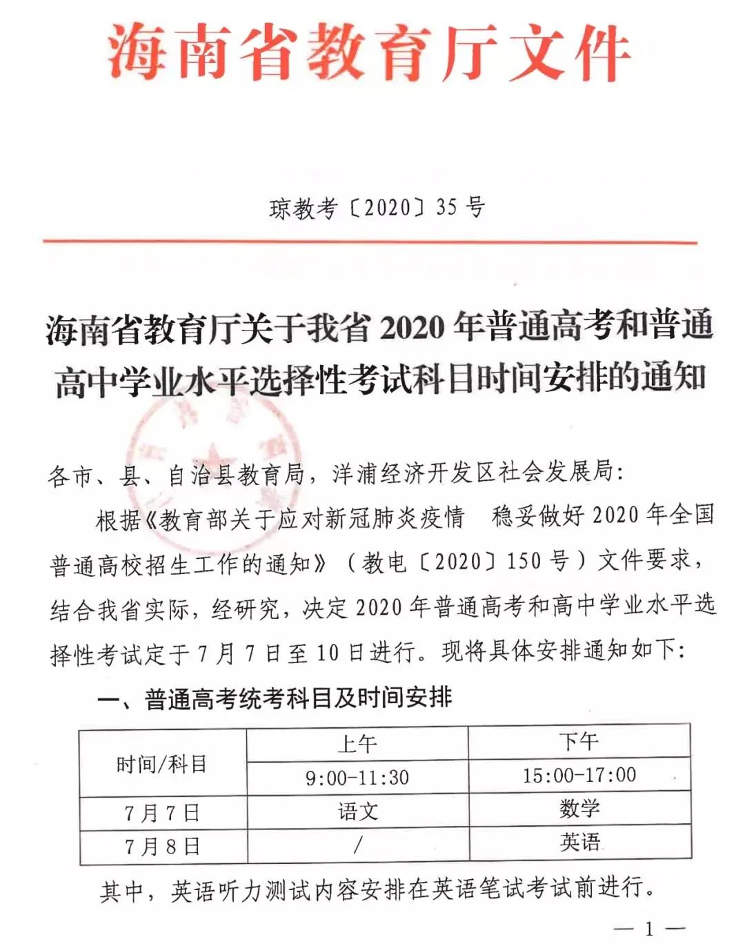 省教育厅最新消息,2020年普通高考和高中学业水平选考试定于7月7日至10日进行,7月7日当天普通高考统考科目为语文和数学,英语在7月8日下午开考。