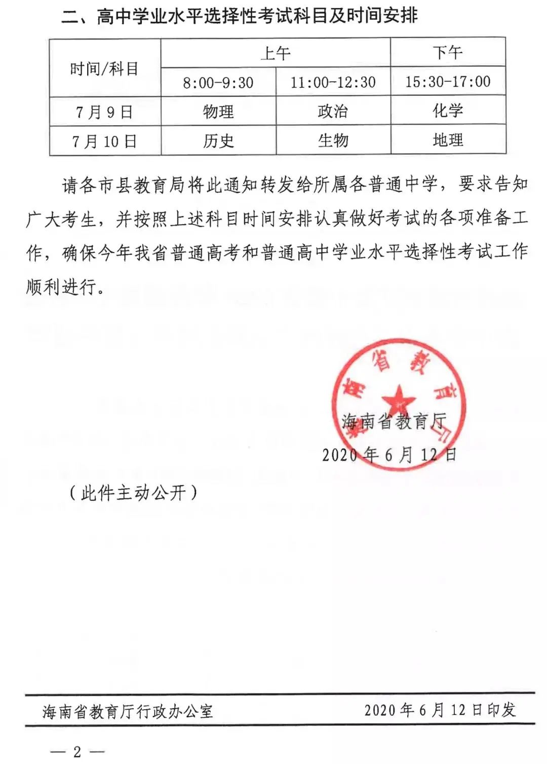 高中学业水平选择性考试科目及时间安排为:7月9日物理,政治,化学三科目开考,7月10日则为历史,生物,地理。