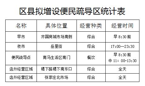 记者从临淄区综合行政执法局了解到,为提高就业保障民生,方便群众,提升城市管理规范,本着“疏堵结合”的原则,拟在临淄区部分区域增设早市、夜市,便民疏导区。