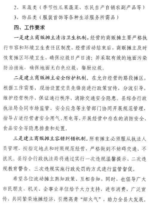 1.鼓励各经营业户在限定的区域内限时、限门类、有序开展经营活动(具体分布点及要求见附件);