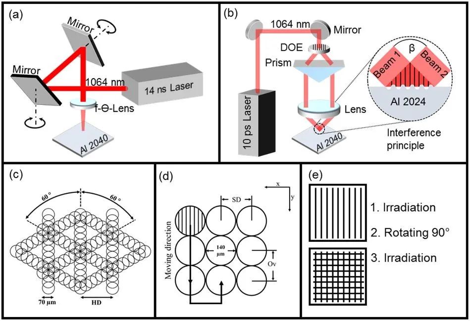 在这项研究中,光束之间的角度设置为8.7°,以获得7.0μm的空间周期。激光通量设置为1.93J /cm⊃2;,激光的重复频率固定为1kHz。使用高精度轴(Aerotech,美国)以±2.5μm的精度在x和y方向上平移样品。通过沿y方向移动样本可以控制脉冲之间的重叠(Ov),最终确定命中某个位置的激光脉冲数(参见上图D)。x方向平移(SD)主要确定了表面纹理的均匀性。