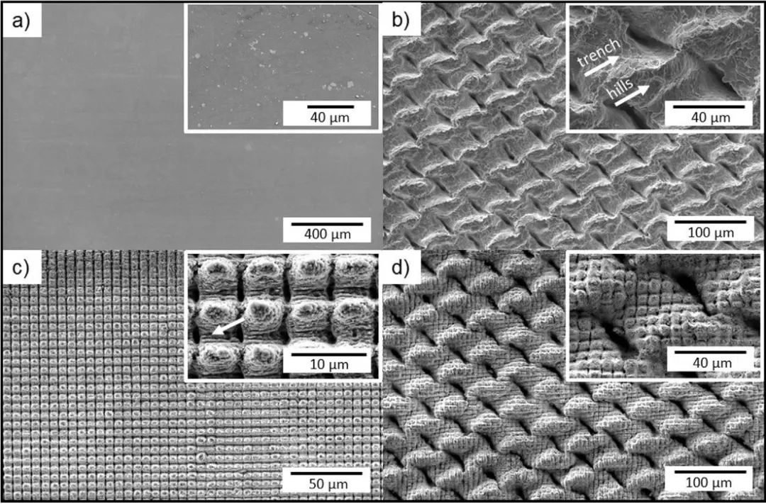 在本项研究中,Ov和SD分别为99%和141.6μm。为了获得柱状结构,必须将样品旋转90°并重复该过程(上图E)。结合激光直写和激光干涉直写技术,制备得到样品如下图。(a,b,c,d分别是未经处理的铝表面,只用激光直写技术DLW处理的表面,只用激光干涉直写DLIP处理的表面,结合DLW和DLIP处理的表面)