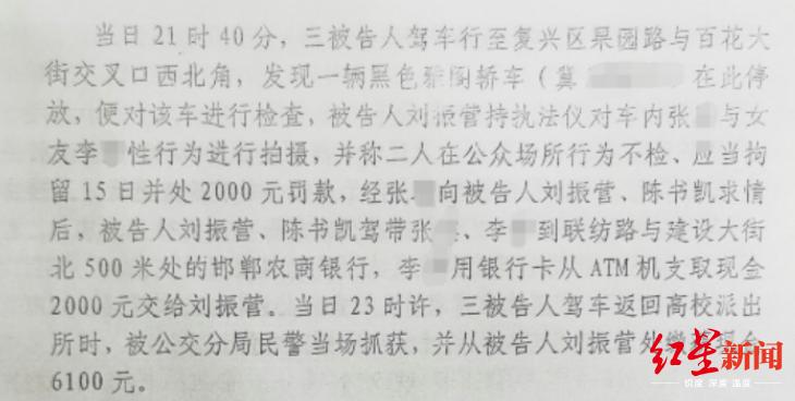 在复兴区,他们又对一车内男子张某、女子李某性行为进行拍摄,并称他们“在公共场所不检,应当拘留15日并处2000元罚款”。