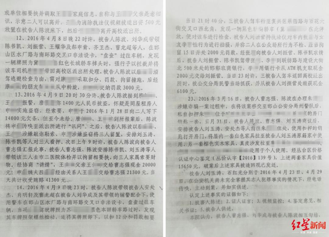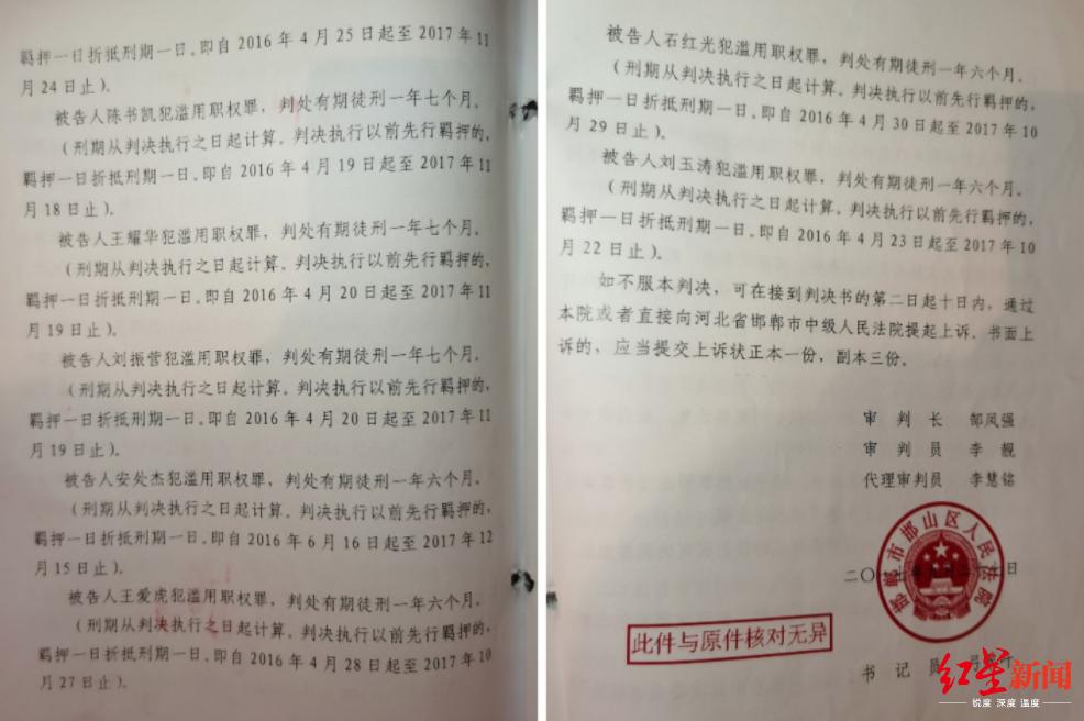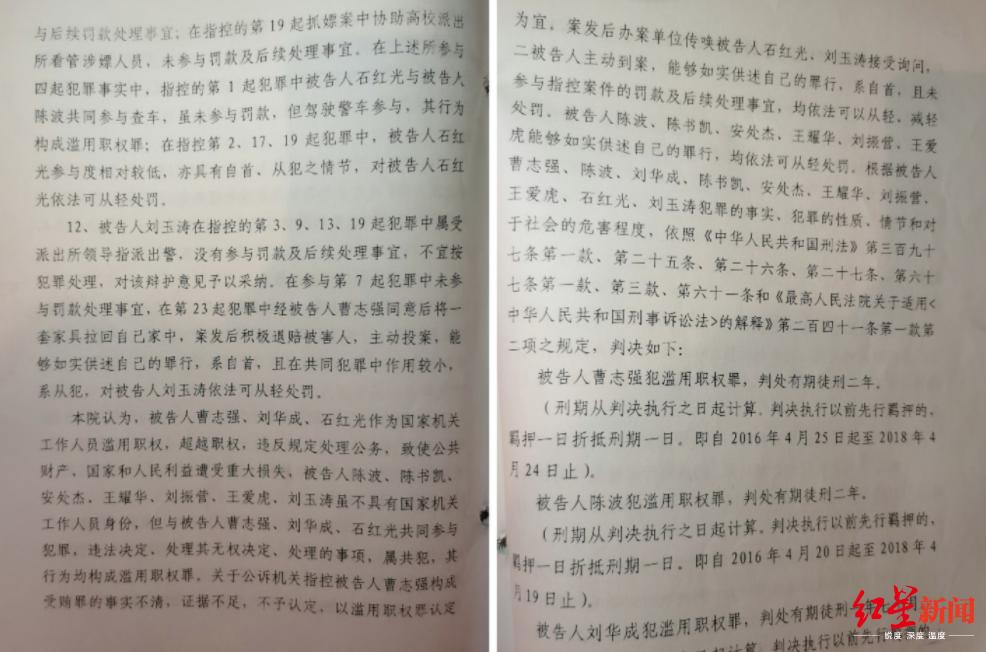 2016年上半年,因涉嫌敲诈勒索罪,上述涉警人员被邯郸市公安局公交分局刑拘。2017年9月,其中10人因滥用职权罪,被邯郸市邯山区人民法院分别判处有期徒刑1年半至2年。