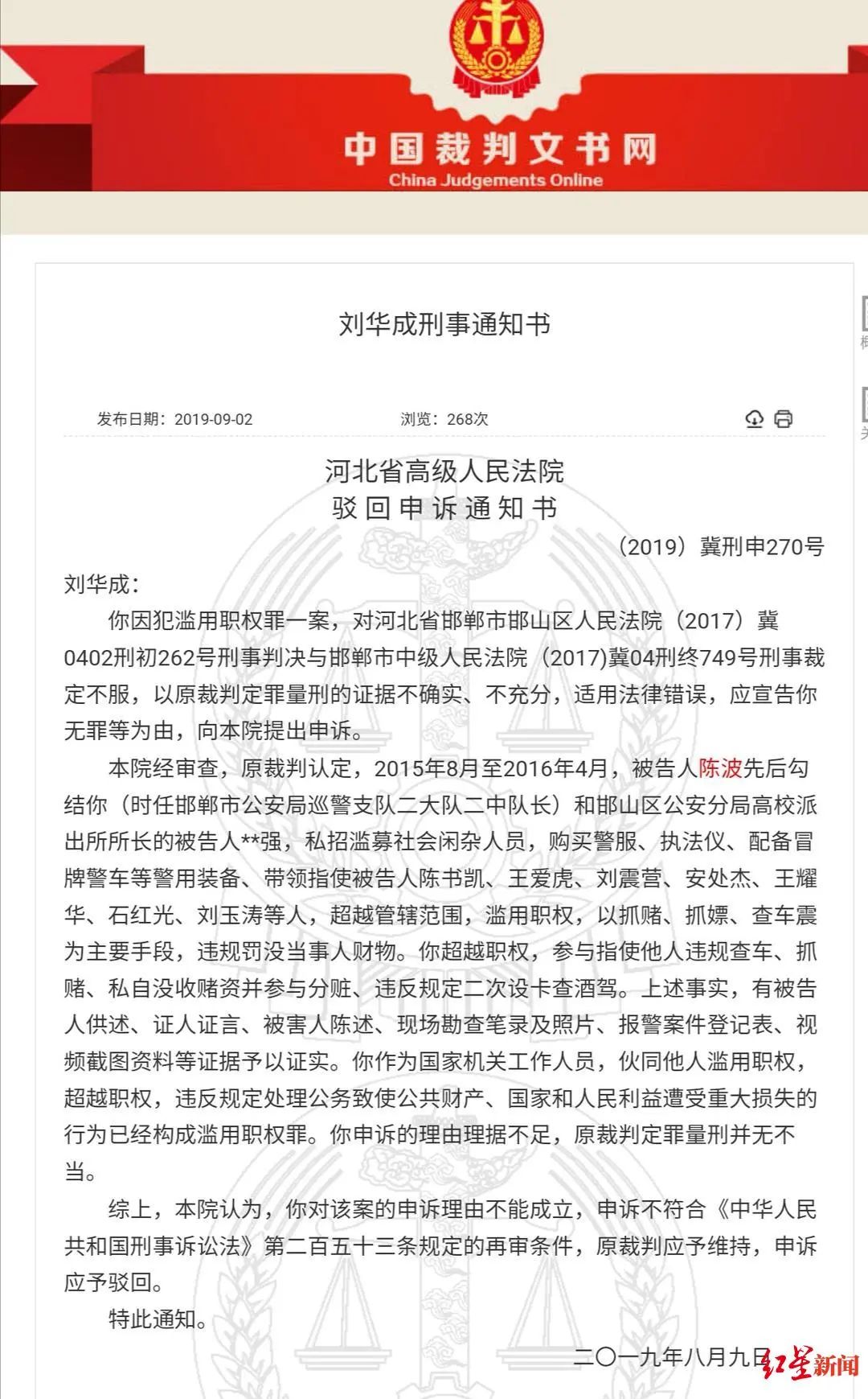 此后,刘华成又提出申诉。2019年8月,河北省高级人民法院以“申诉理由不成立,原裁判定罪量刑并无不当”为由,驳回了刘华成的申诉。