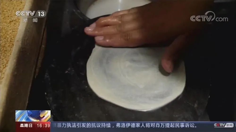两只手轻轻地提起来,然后快速摊到这个晃盘里面,然后左手四指轻轻用力,这个时候你看不到有力量的,其实它是带有力量的,有一点像我们的传统的武功,太极拳的感觉。太极拳就是很柔,其实周村烧饼整个制作技艺过程,关键点是很柔的,看似没有力量,其实它是有内力的。