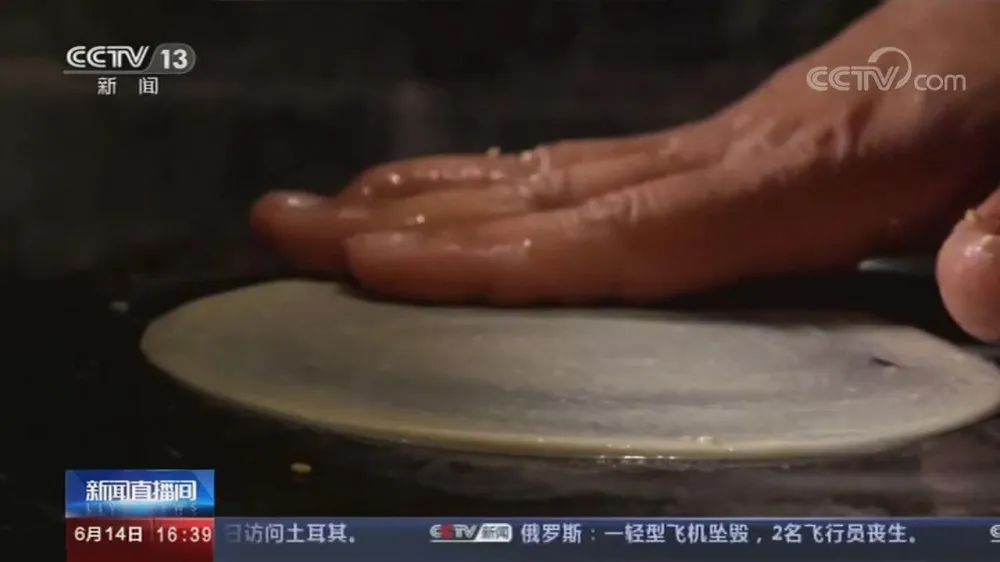 用力过大他就容易破了,用力过小了就定粘在碾盘上面不动了,所以它的力道要恰到好处,而且要有分寸感。因为这个关键步骤是决定了周村烧饼尺寸的大小。