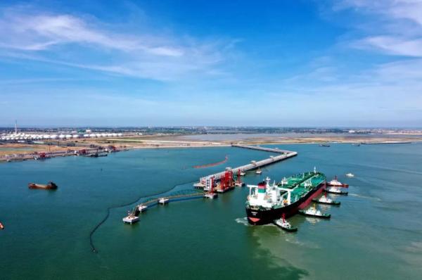 5月8日,来自中东的“凯名”号VLCC油轮安全靠泊原油码头并顺利接卸,标志着中科炼化港口正式建成投用,这是目前国内一次建成规模最大、结构形式和使用功能最多的港口。成品油及化工产品可直达华南市场,又可以辐射大西南,同时可以利用临港优势,直接出口面向国际市场。