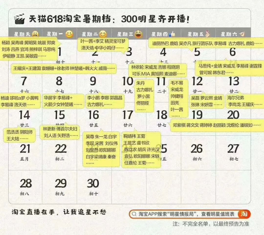 淘宝最早从去年就开启“启明星计划”,邀请明星入淘直播。今年,刘涛入职了聚划算,汪涵开启了直播综艺带货。618期间,还有300位明星、4大卫视与40多档综艺入驻淘宝直播。