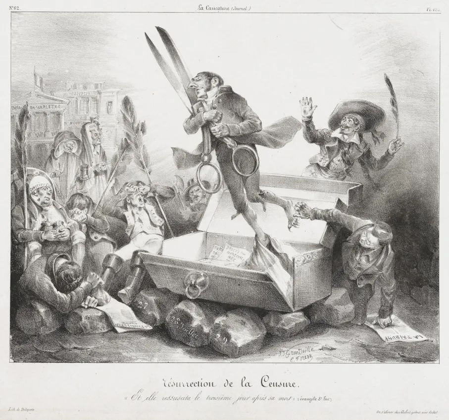 在复辟时期,艺术家们创造了一种符号元语言来逃避审查:审查制度本身被拟人化为一把永远在攻击的大剪刀,神职人员被描绘成忙于熄灭启蒙之光的熄烛人,而复辟政权的政治人物则被刻画成只知道倒着走路的龙虾。