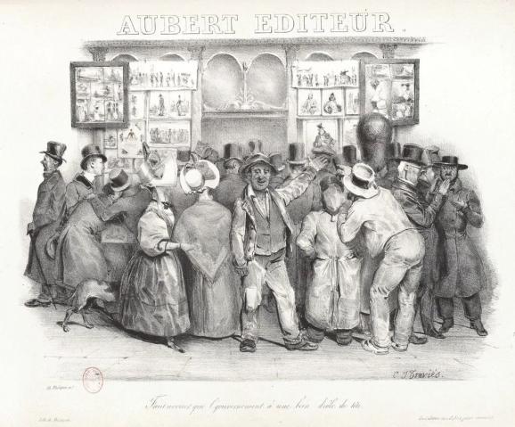 他的帝国涵盖奥贝尔出版社(以他姐夫的名字Aubert命名)和几种期刊,包括《讽刺画报》(1830-1835)和《喧闹》(Le Charivari,1832-1937),原副刊名为《伦敦喧闹》(The London Charivari)的英国杂志《笨拙》(Punch)正是受到了后者的启发。他还开了一家零售店,在那里可以买到他旗下期刊的不同版本:黑白版或手工上色,不同纸质,单期、作品集或是合集本。那些没钱买的人可以赏读他商店橱窗中不断更换的刊号陈列,这往往是政治反对派意见的免费展览。他委托特拉维耶斯画下他的商店,利用这个机会画出了这一内容:橱窗里陈列着梨子图画,一个看客指着其中一幅说:“你得承认国家头头看起来怪滑稽的。”