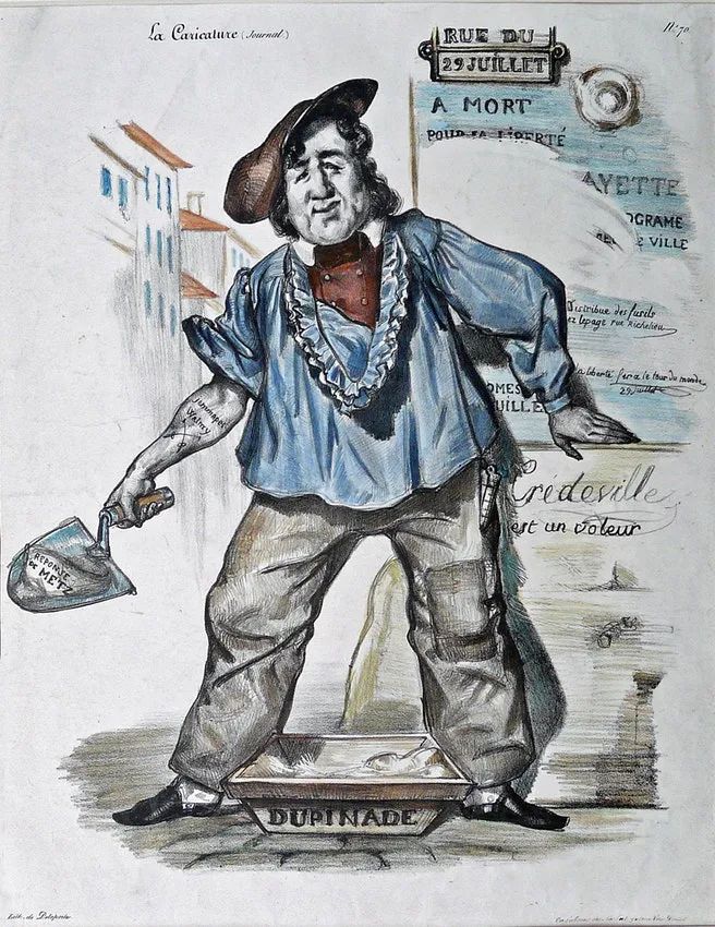 这幅画中有几处特征使其政治意义显得无可争议。其中最醒目的是“7月29日的街道”,这是正统派君主政体瓦解、路易-菲利普君主立宪政体建立的日子;另一处细节是“自由或死亡”,这是革命的口号。泥瓦匠所用的水泥槽上写着“Dupinade”:安德烈·杜潘(André Dupin)是众议院里最直言不讳的保守派,他反对1830年革命承诺要实行的每一项改革。然而,使得菲利庞的命运板上钉钉的却是这个泥瓦匠和路易-菲利普长相上有明显的相似之处,这明确地违反了新的审查法。