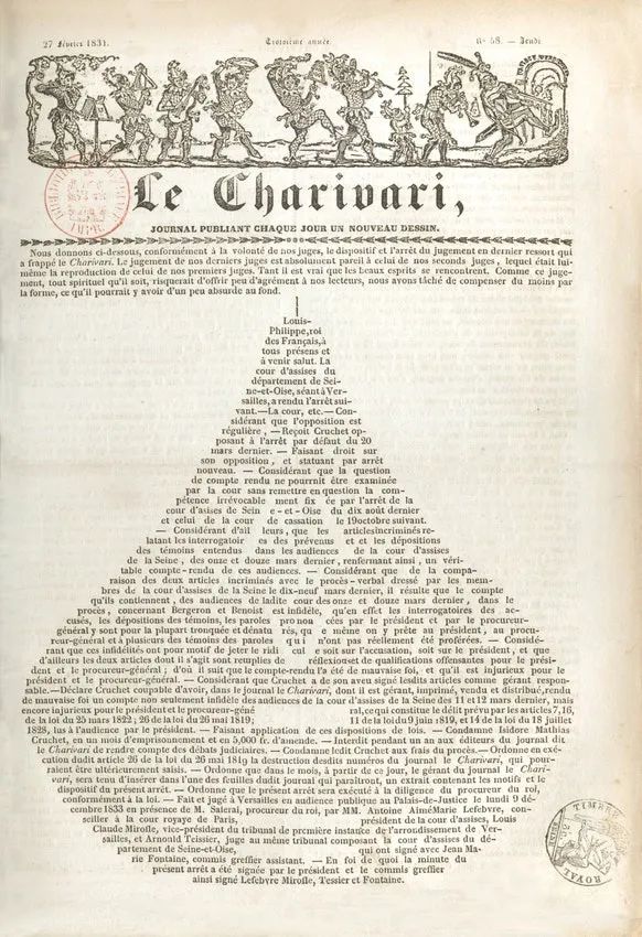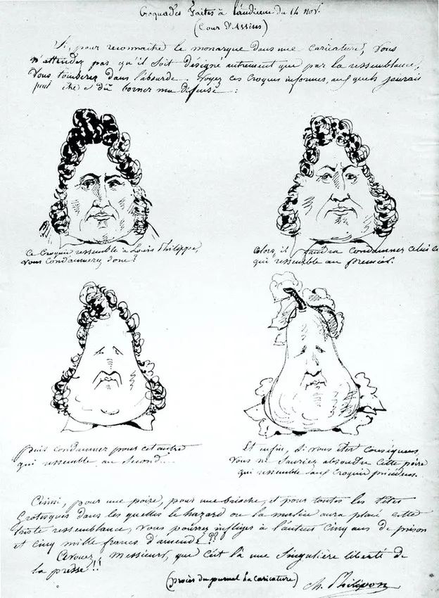 他向《喧闹》的读者解释说:“尽管这判决或有其滑稽之处,但鉴于它多半无法为我刊读者带来几分娱乐,我们试图至少在形式上弥补其内容之荒谬。”于是他把判决书的文本印刷成了梨形,开头是这样的:“法国国王路易·菲利普,向在座和未至的所有人致意。设在凡尔赛的塞纳-瓦兹省(Seine-et-Oise)巡回法院作出以下判决。”
