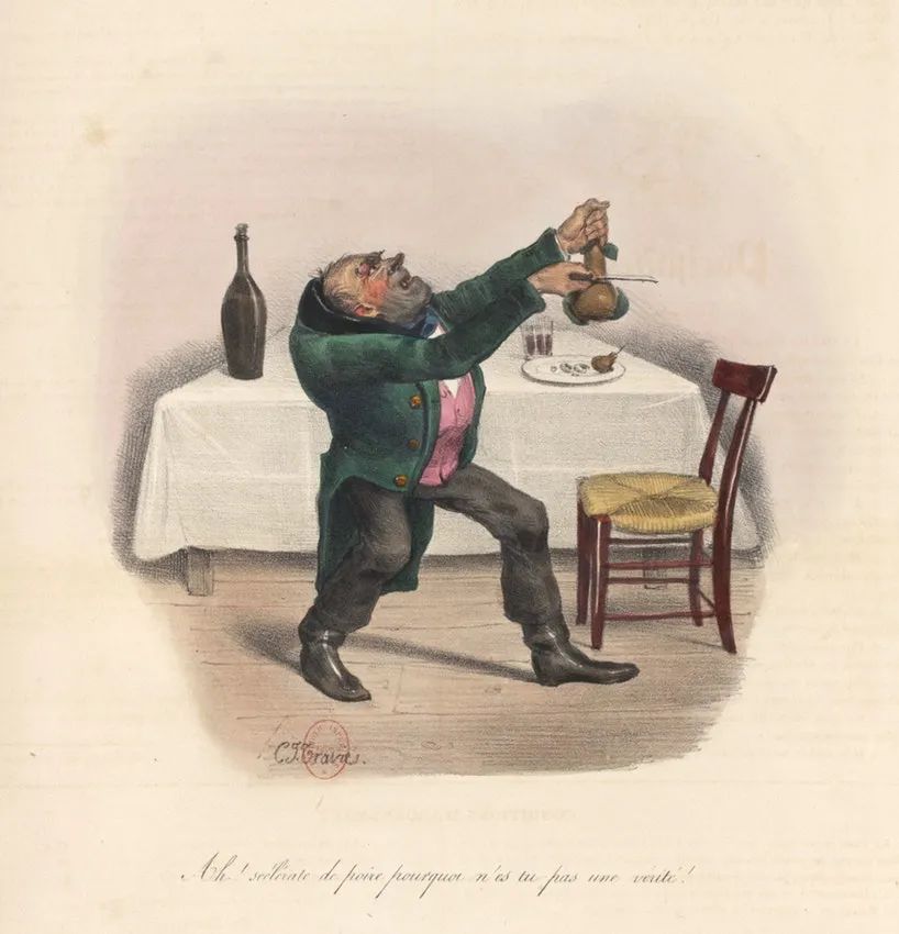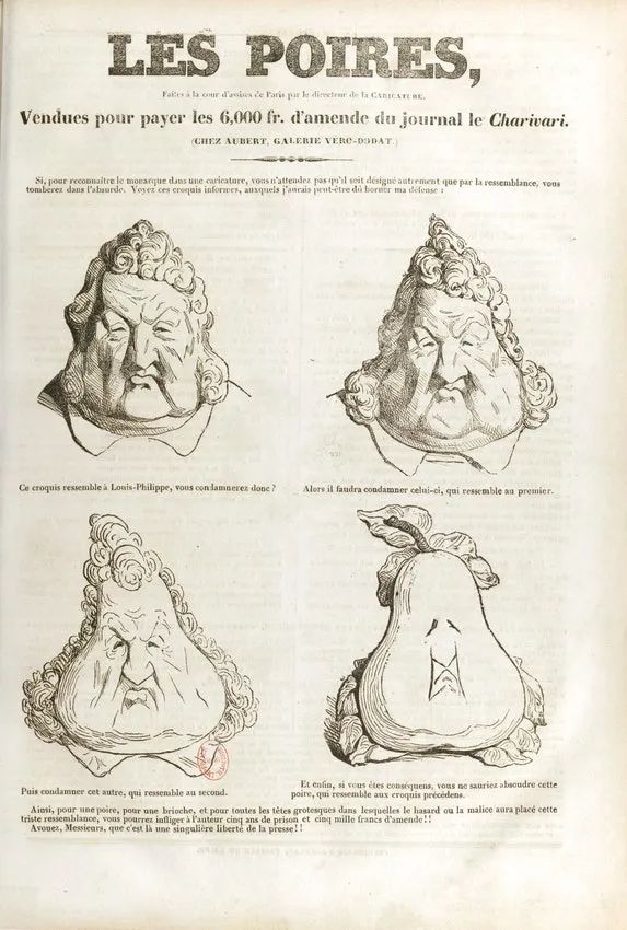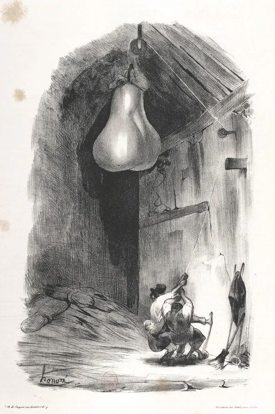 说实话,路易·菲利普的相貌确实有点像梨,但更妙的一点是,法语的梨一词是“poire”,也有“傻瓜”之意——不过现在就这一含义是早于还是源于菲利庞的隐喻存在争议。菲利庞的辩护没有打动他的法官,他被判处6个月的监禁和2000法郎的罚款。他也并非唯一一个遭遇这种命运的人;许多艺术家,包括19世纪最著名的讽刺画家杜米埃,都曾因反动画作锒铛入狱。