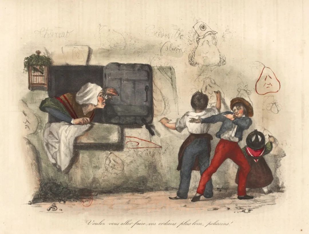 这群艺术家首先为《讽刺画报》大量绘制了梨画,从1832年开始,他们也为《喧闹》画梨。在1833年1月版的《讽刺画报》中,奥古斯特·布凯(Auguste Bouquet)描绘了一位老妇人试图阻止三个勤劳的小男孩往她家的墙壁上画梨,并对他们喊道:“到远处去画这脏东西,你们这些小恶魔!”几个月后,在《喧闹》中,特拉维耶斯在《梨子变得流行了》(The Pear Has Become Popular)里刻画了一幅类似的景象,他画了一个在墙上画梨的街头顽童,说明文字是:“这些日子里巴黎的墙壁就是这么装饰的。”