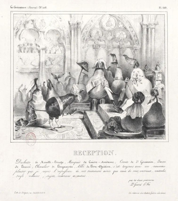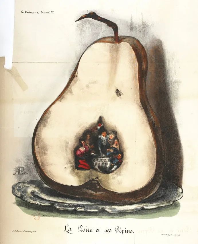 在其中一个这样的专制政权统治下,19世纪的法国讽刺画家创作出了现代历史上最有力的政治隐喻之一:把路易·菲利普国王描绘成了一只梨。18世纪末英国革命时期,法国从英国舶来了讽刺漫画,要想逃避1815年法国波旁复辟时期颁布的严苛审查法,它十分合适,故而这一时代虽不甚理想,用以孕育这类创作却也足够成熟。