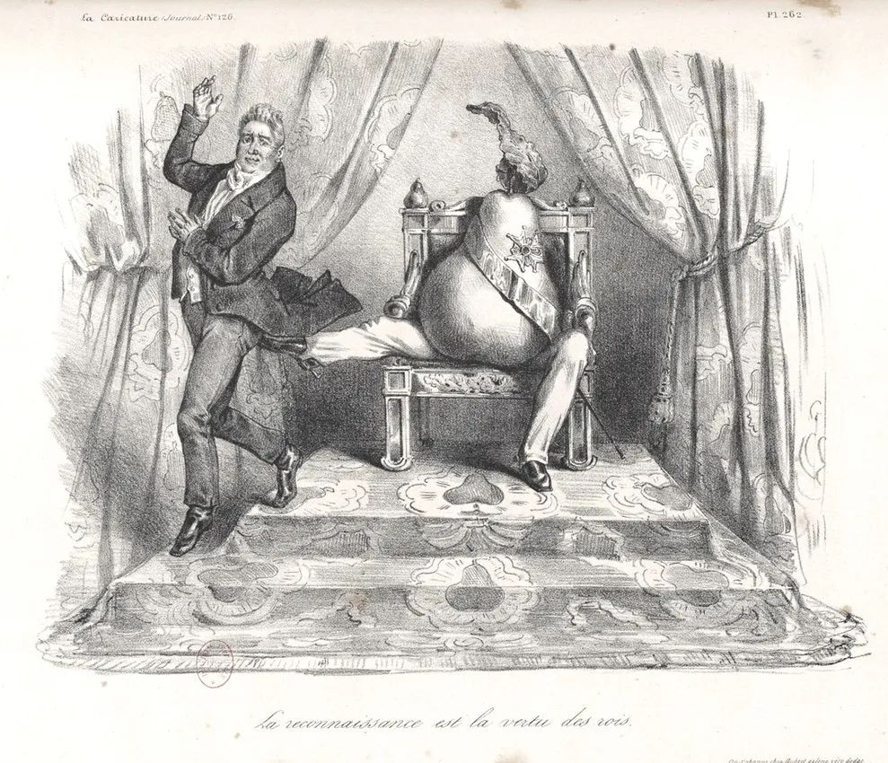 路易·菲利普对他的支持者是出了名的缺乏忠诚,这一点在德佩热的《感恩是君王的美德》(Gratitude is the Virtue of Kings)中得到了体现:梨国王坐在一间屋子里,屋里的垂帘、地毯和王座上都饰满了梨图案。他在他最早的支持者之一、部长会议主席雅克·拉菲特(Jacques Laffitte)的屁股上踢了一脚,唐突地赶跑了他。皇恩浩荡。