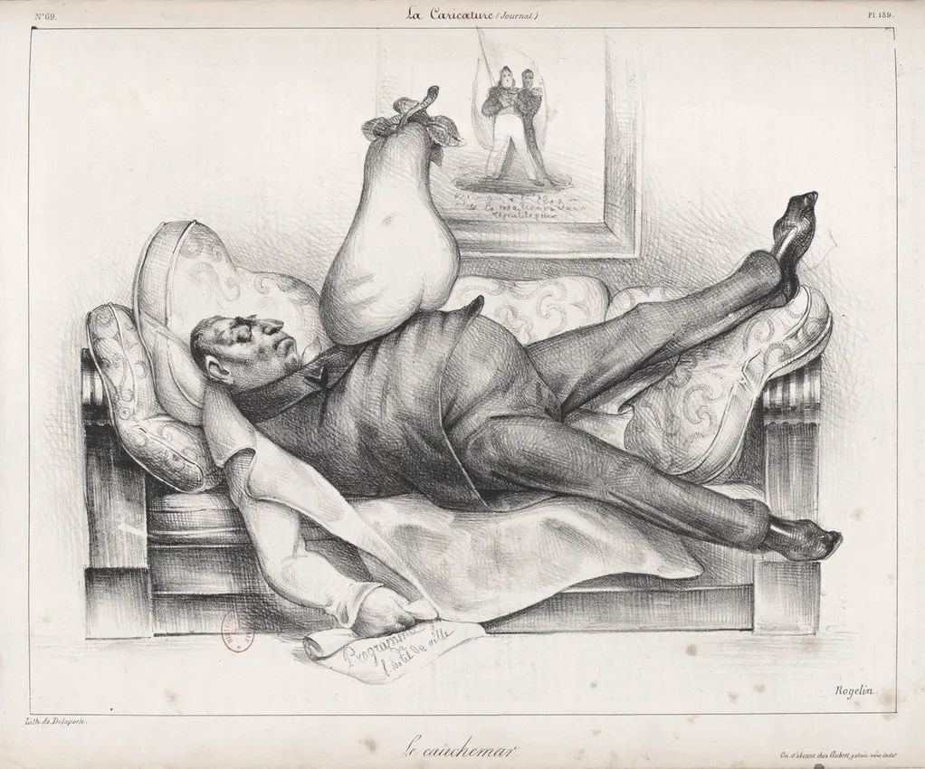 在《梦魇》(The Nightmare)中,杜米埃戏仿亨利·菲斯利(Henry Fuseli)1781年的同名著名画作,画中国王的另一位早期支持者拉法耶特将军(General Lafayette)因意识到自己的错误而备受重负,在这里,这一错误被具现化成一只巨大的梨,沉重地压在沉眠的他身上——他手边的文件列出了路易·菲利普违背的承诺。