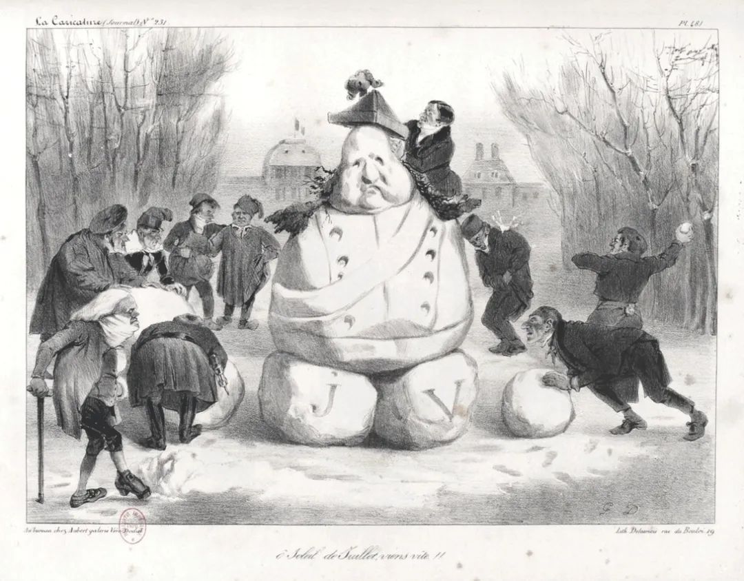 它的说明文字是一段长长的分析理据,“解释”说画中将大臣们描绘成了孩子,这些孩子不小心把雪人堆成了国王的样子,所以希望7月的太阳快点来,在他们被指控违反审查法之前把雪人融化掉。但是,当然啦,每个人都明白,这实际上是在接近明目张胆地呼吁让1830年七月革命重演。