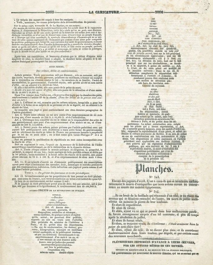 他的承诺是短暂的;短短几个月后,他就颁布了“惩罚新闻界攻击国王及其立法机关的权力和权威的法律”。违反此法者会被判处3个月到5年的监禁,并罚款300至6000法郎。尽管这种严厉的惩罚并未吓退政治反对派,但它确实引发了更多足智多谋的规避之法。