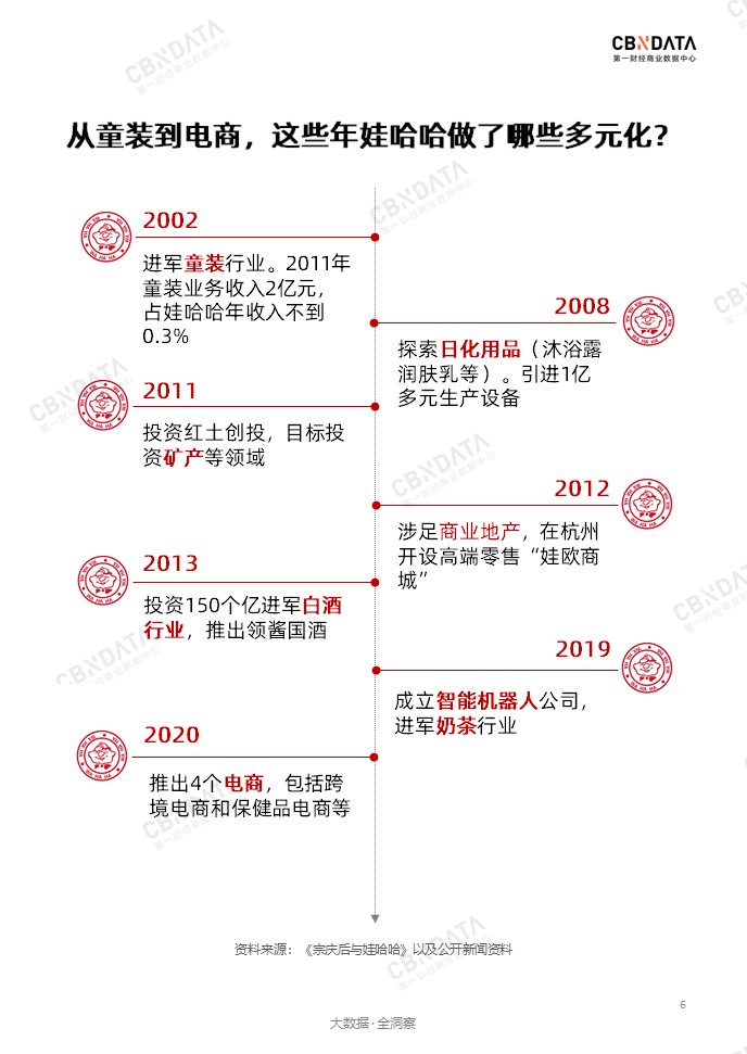 在饮料(和早期的保健品)之外,娃哈哈其实做了多元化的尝试,但是都不成功。它做过方便面、白酒。食品饮料外,娃哈哈还尝试过卖童装,开商场(还是买手制的精品商场)、美食城,甚至试过护肤品、儿童教育。