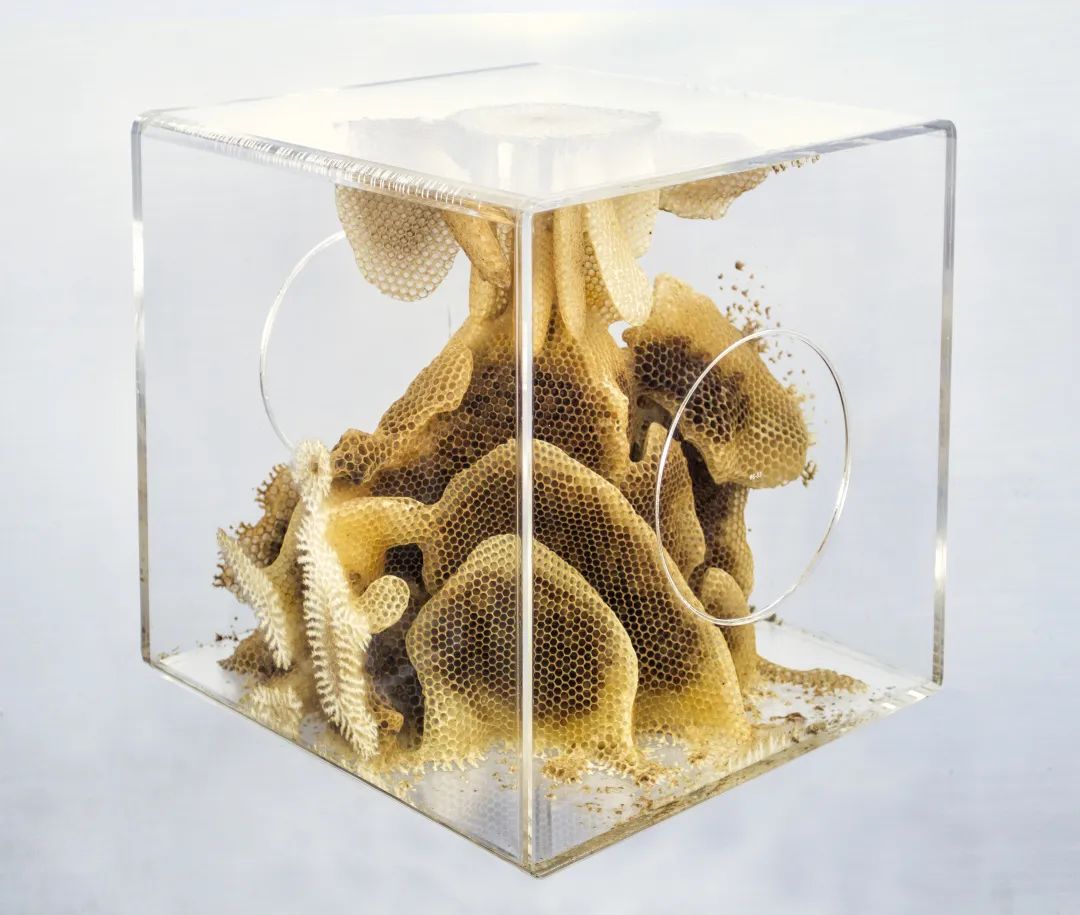 展览的第一部分多为成名的欧美艺术家,第二部分则突出亚洲艺术家特别是青年艺术家的思考。例如,赵仁辉收集了55个被人类影响的故事,进而对其进行研究和亦真亦假的写作,最终以书和摄影的方式呈现,他的另一件作品则将与艺术家共处一室的昆虫进行了博物学式的陈列;任日与蜂群以及随机概率一起创作出蜂蜡雕塑,预示未来的创作主体不一定是人类而很可能是一种混合身份;徐维静关注蚕与现代机器逻辑的融合,通过艺术将生物、技术和文化编织在一起;林沛莹以写作来讨论病毒对人类而言可能并非寄宿与致病而是共生的关系;刘娃借助脑电波技术将理智与情感这一对抽象概念通过主客体的并置呈现出来;塔尔·丹尼诺 (Tal Danino) 在高倍显微镜下发现了微生物的分裂与宇宙大爆炸之间图像的高度相似。