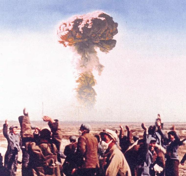 此时的天空宛若双日高悬,接着,飓风般的冲击波从爆心袭向四周,爆炸巨响,震耳欲聋——一朵壮观的蘑菇云喷涌在戈壁滩上。这昭示着中国第一颗氢弹试验爆炸成功。