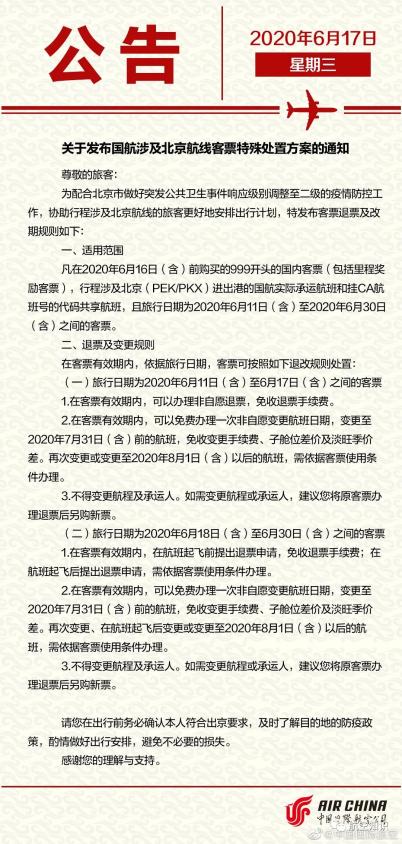国航针对北京特殊退改政策按航班起飞时间分为两条。