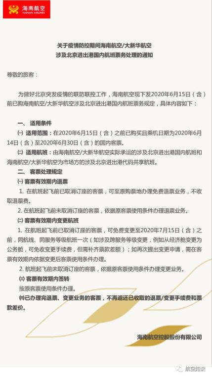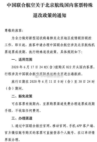 南航客服人员表示,6月14日前从南航官网购买的从北京出发,行程在6月14日至6月30日之间的,可申请自愿退票,不收手续费。