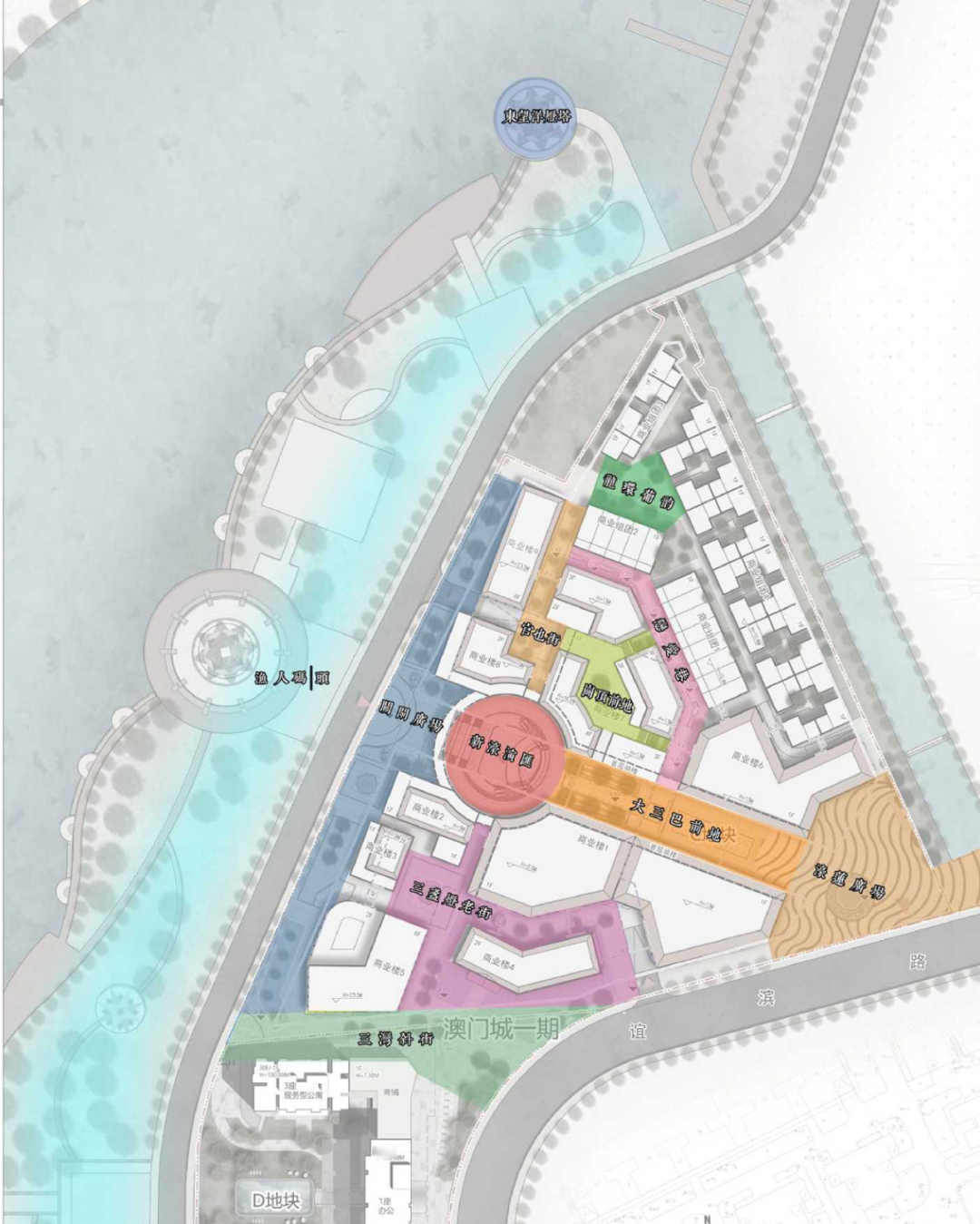 多彩的欧洲建筑与中式市集风格,见证了澳门多元文化的城市特点,澳门城的濠莲广场吸取澳门议事厅前地的特点,从建筑风格,铺装景观进行复制,打造澳门城的会客厅。