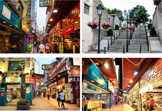 澳门城的三湾斜街,设计在公寓地块和特色步行街之间,除了体现高差地形之外还展现了新老结合的特色风貌。