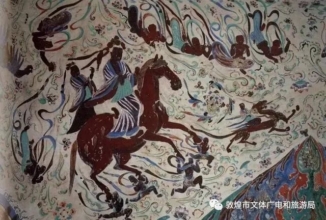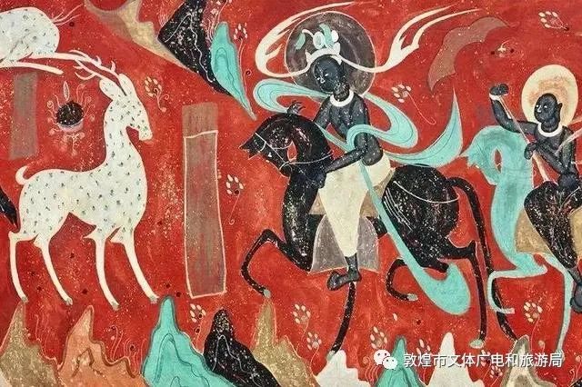 图中玄奘正带着白龙马、悟空去取经的路上,这幅壁画比吴承恩写《西游记》的时间早了三百年。