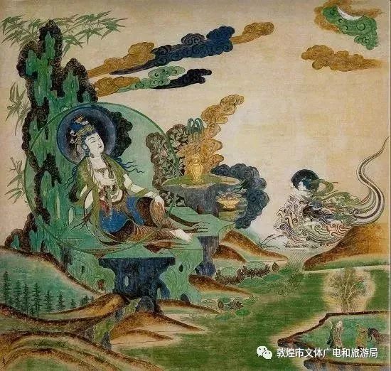 这幅壁画的右下角就是玄奘和悟空。师徒二人正隔水遥礼观音。